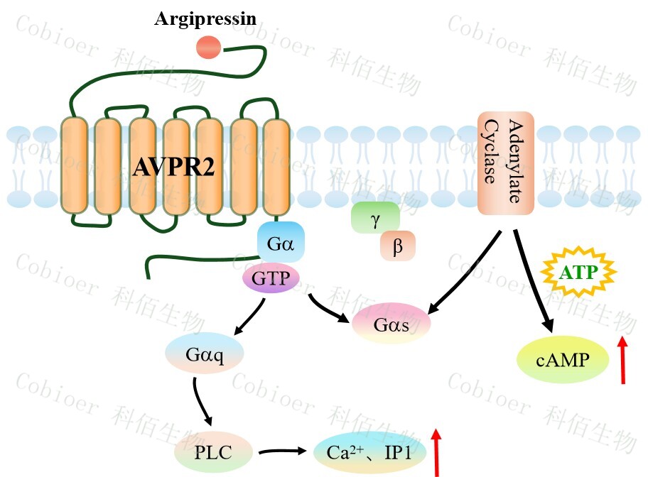 AVPR2(精氨酸加壓素受體 2 型)是一種主要分布于腎臟集合管上皮細(xì)胞基底側(cè)的 G 蛋白偶聯(lián)受體(GPCR),屬于加壓素/催產(chǎn)素受體家族,其特異性配體為垂體后葉分泌的 精氨酸加壓素(AVP,又稱抗利尿激素 ADH);該受體通過偶聯(lián) Gs 蛋白,激活腺苷酸環(huán) 化酶,升高 cAMP,激活蛋白激酶 A(PKA),最終磷酸化并促使水通道蛋白 AQP2 向細(xì) 胞膜轉(zhuǎn)位,從而增加水的重吸收、濃縮尿液并維持體液平衡;其功能缺陷是 X 連鎖隱性遺 傳性腎性尿崩癥(NDI) 的主要病因(占 90%),患者因基因突變導(dǎo)致受體失活,表現(xiàn)為 多尿、煩渴及低滲尿,而獲得性異常則與鋰中毒或梗阻性腎病相關(guān);此外,AVPR2 作為藥 物靶點(diǎn),其拮抗劑(如托伐普坦)已用于治療低鈉血癥和心力衰竭的體液潴留。 |