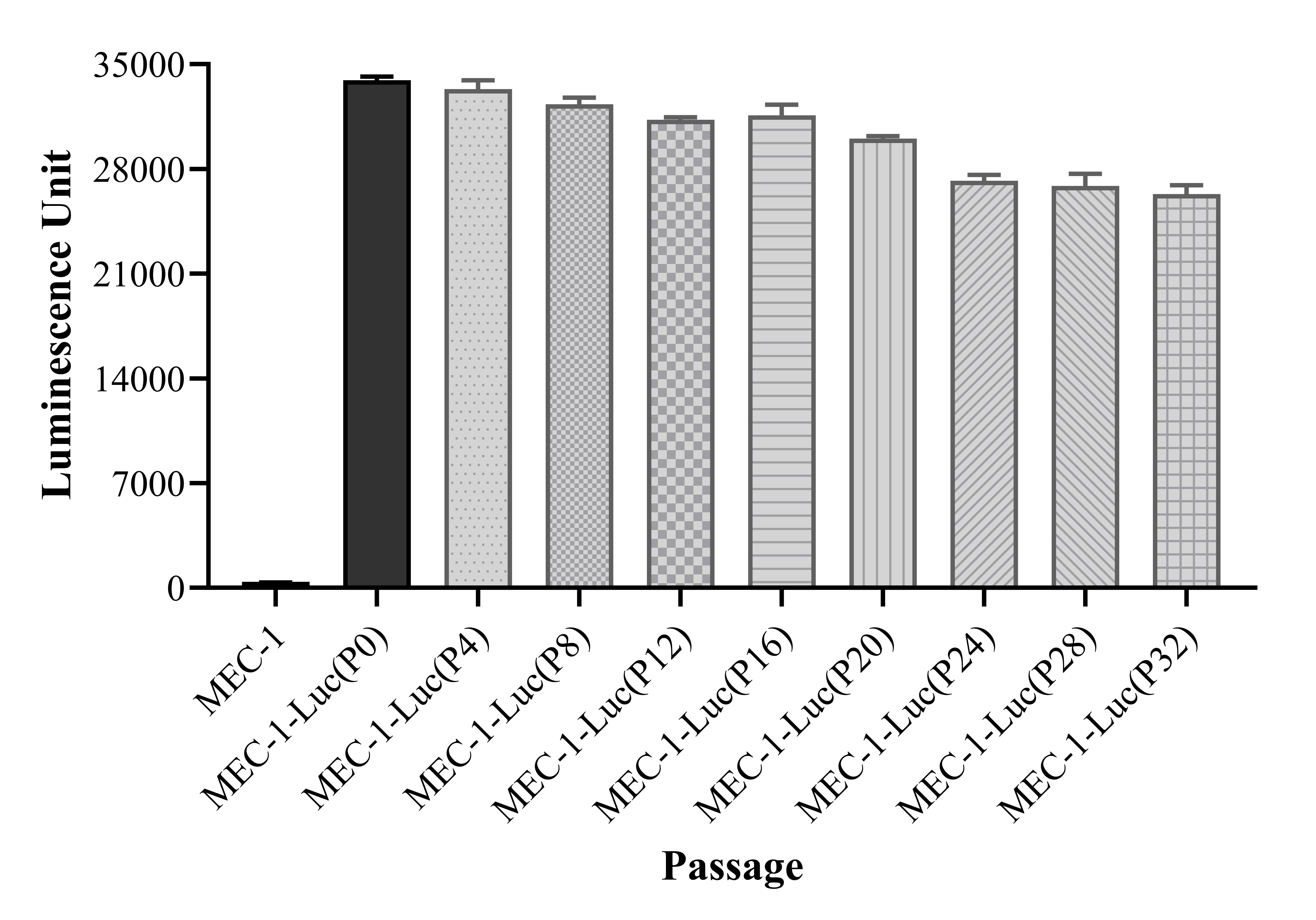 | Figure 1. Stablity test results. MEC-1-Luc showed at least 32 passage stability with similar luminescence unit. | |