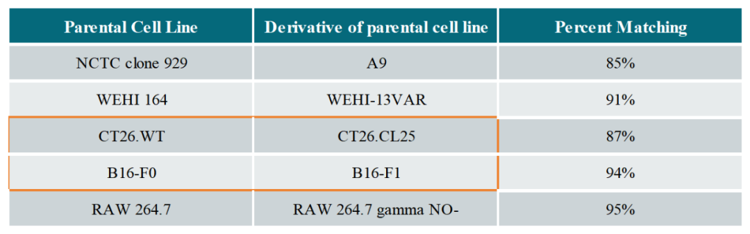 1. B16-F0、B16-F1等衍生細胞系STR匹配度>90%,無法區(qū)分。
