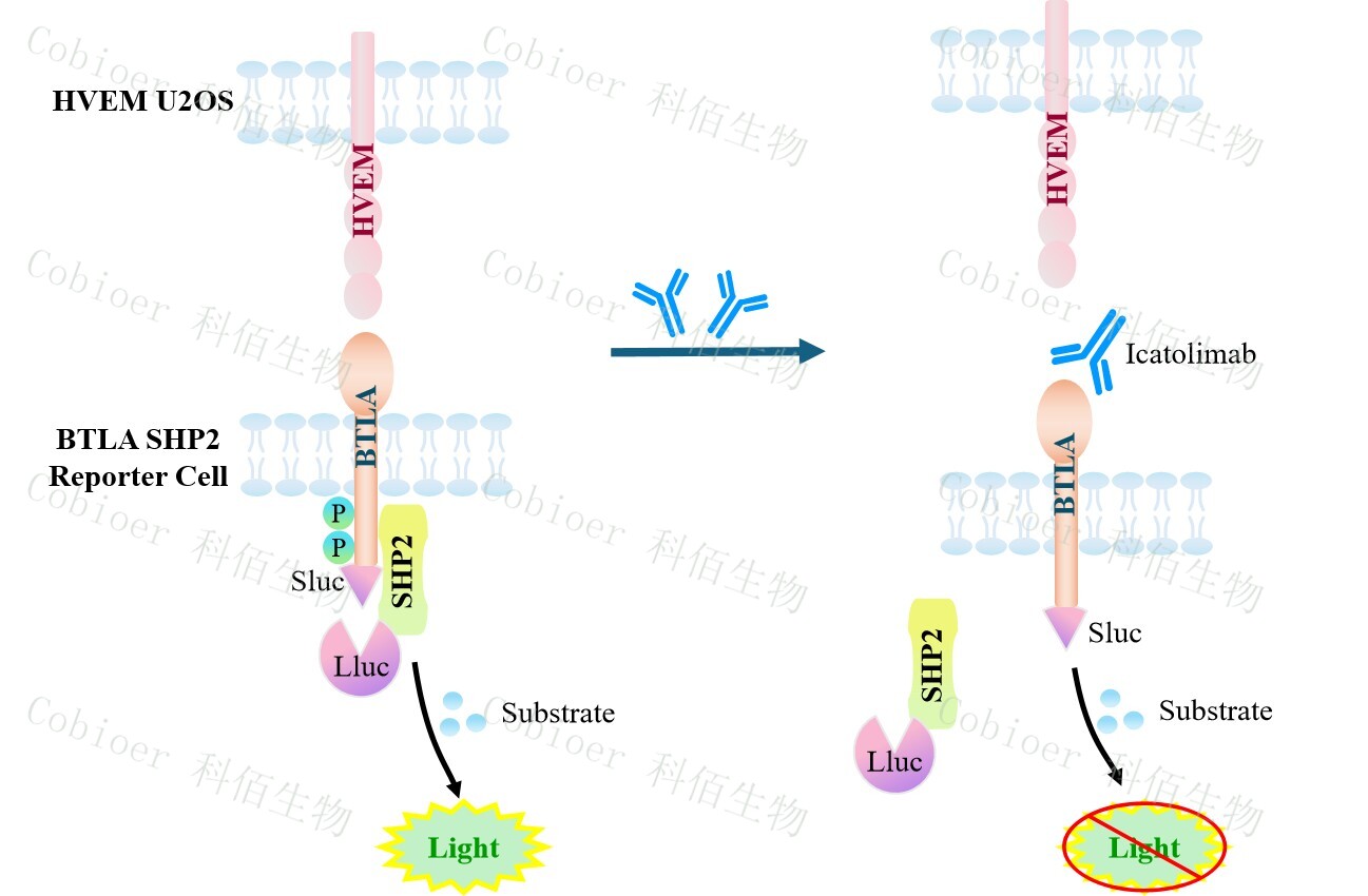 BTLA SHP2 Reporter Cell 報(bào)告基因藥靶模型很好的模擬了體內(nèi) BTLA/SHP2 的信號(hào)轉(zhuǎn)導(dǎo)過程,原理見下圖所示。![]() Figure 1. BTLA SHP2 Reporter Cell 細(xì)胞模型原理圖 |