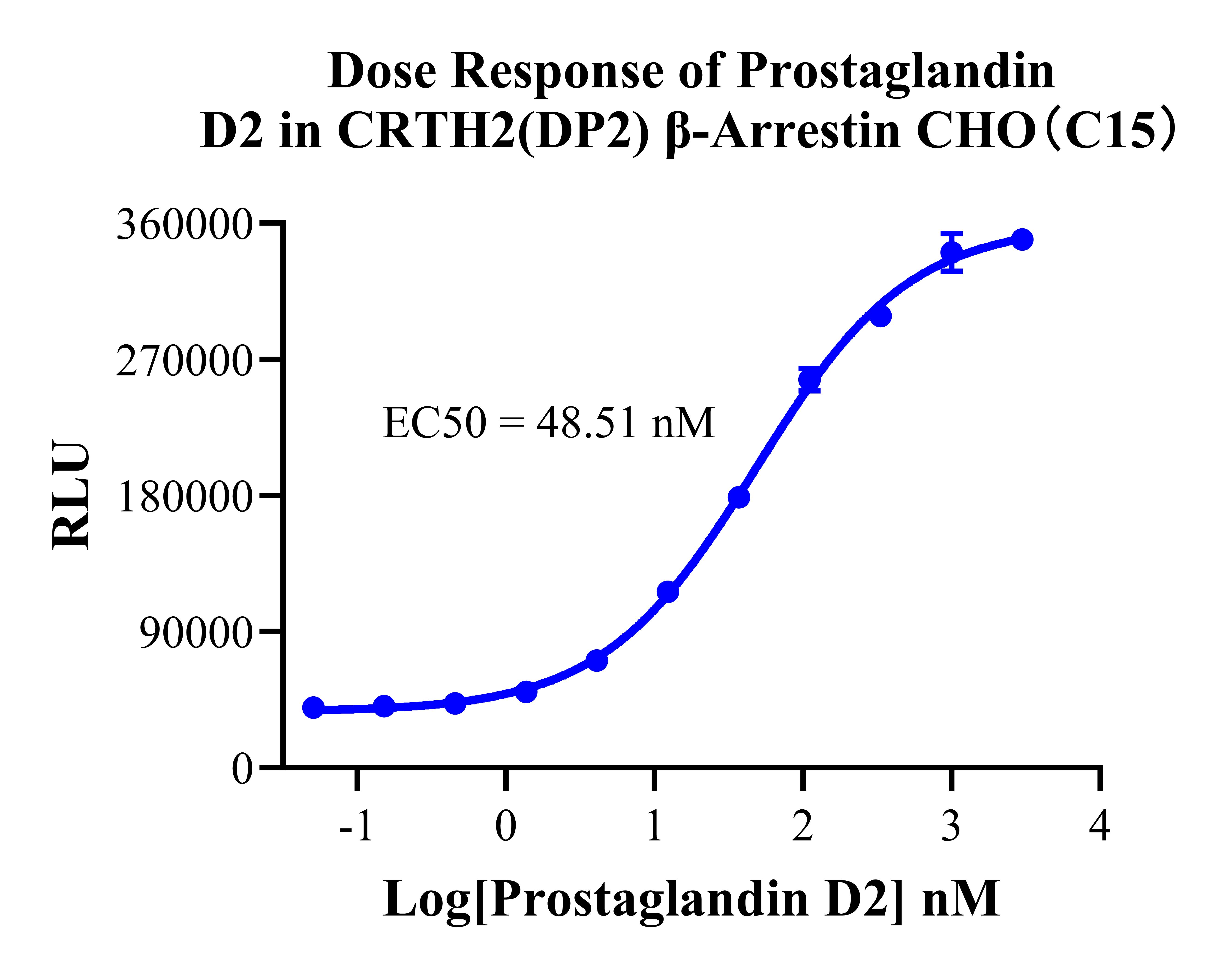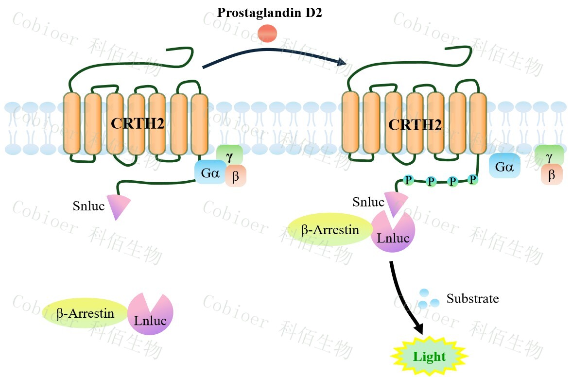 CRTH2(DP2) β-Arrestin CHO 報告基因藥靶模型很好的模擬了體內(nèi) CRTH2(DP2)/β- Arrestin 的信號轉(zhuǎn)導(dǎo)過程, 原理見下圖所示。 當(dāng)缺乏配體刺激時 , β-Arrestin 不與 CRTH2(DP2)結(jié)合,融合β-Arrestin 的熒光素酶處于失活構(gòu)象,當(dāng) CRTH2(DP2)遭遇配體刺 激時,融合熒光素酶報告基因的β-Arrestin 被招募,使熒光素酶報告基因處于激活狀態(tài),加 入其底物后發(fā)光信號增強(qiáng)。![]() Figure 1. CRTH2(DP2) β-Arrestin CHO 細(xì)胞模型原理圖 |