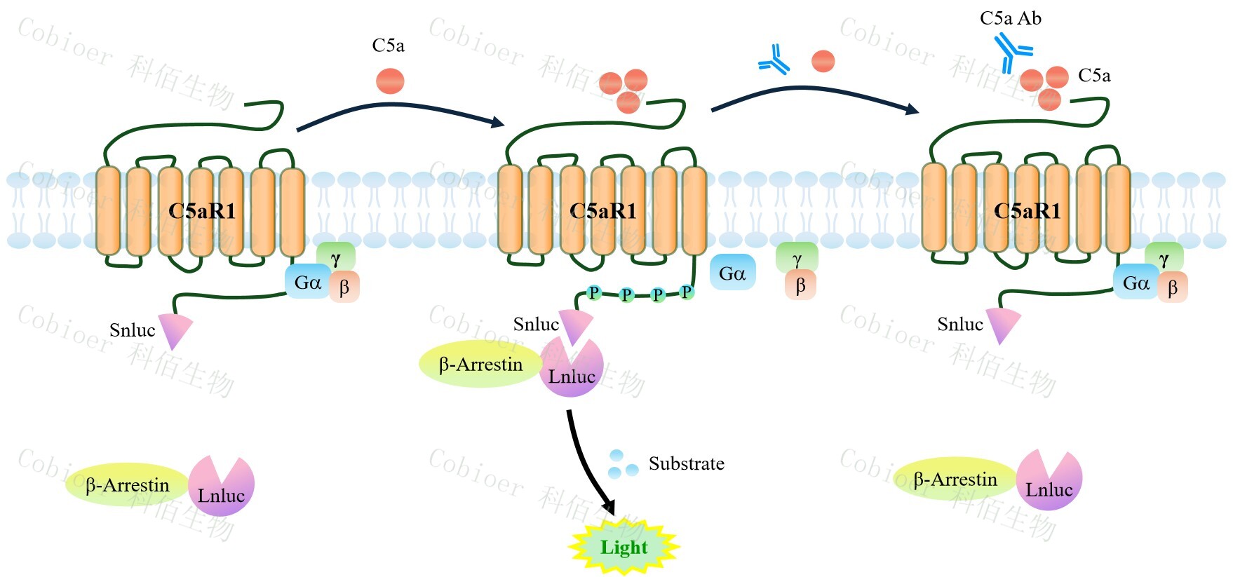 C5aR1 β-Arrestin CHO 報(bào)告基因藥靶模型很好的模擬了體內(nèi) C5aR1/β-Arrestin 的信號(hào)轉(zhuǎn)導(dǎo)過(guò)程,原理見下圖所示。![]() Figure 1. C5aR1 β-Arrestin CHO 細(xì)胞模型原理圖 |